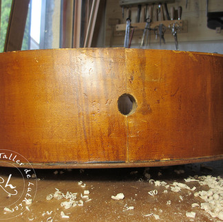 Despues había que corregir los aros, pues estaban mal ajustados con las tapas. Para ello hemos recortado 2mm en la unión de los aros a la altura de la pica, desencolando y volviendo a encolarlos en el taco de madera interior.